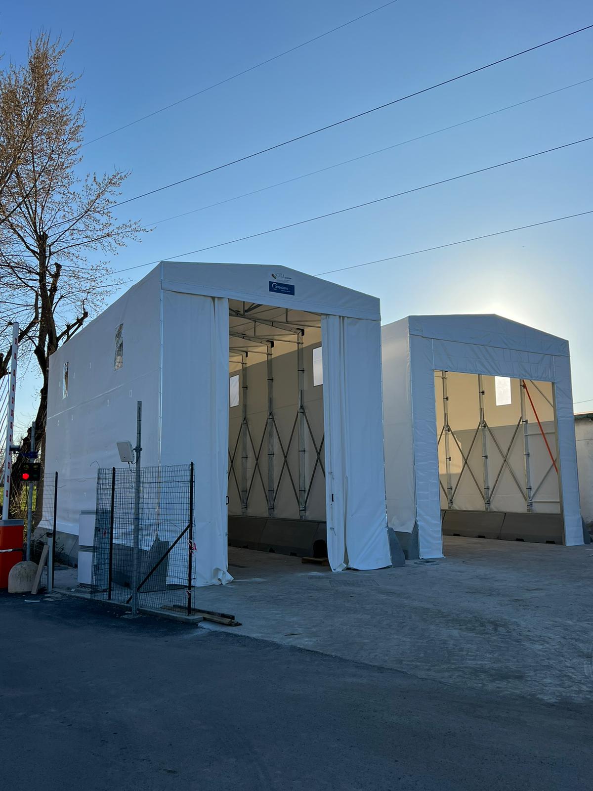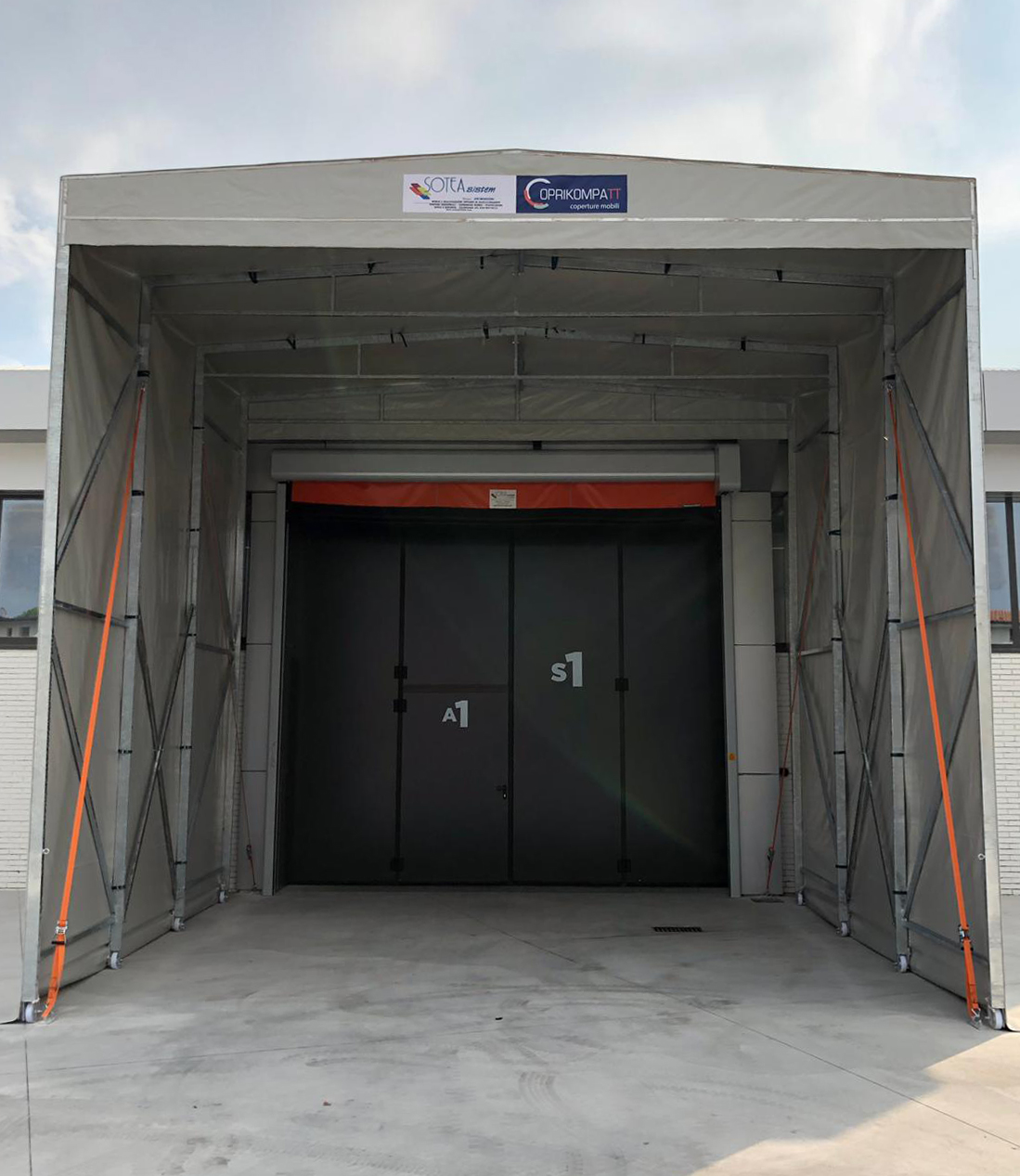 Il tunnel mobile CTS può essere realizzato autoportante, con due testate rigide anteriori e posteriori, diventando un magazzino indipendente, oppure installato a parete in senso perpendicolare, soluzione perfetta per proteggere le operazioni di carico/scarico direttamente dagli edifici esistenti.