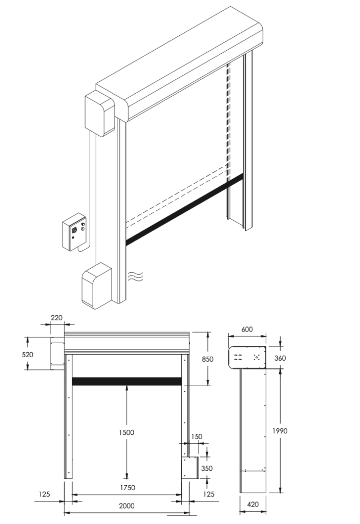 Il pannello di controllo è user-friendly con diagnostica avanzata e plug & play. Altezza e larghezza massime 5.500 mm, apertura fino a 3,6 m/s e chiusura fino a 1,2 m/s. La porta è conforme alla normativa EN 13241-1.