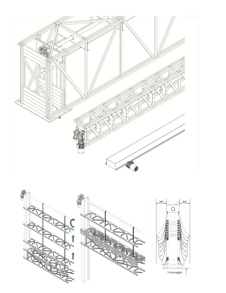 Il manto è in PVC privo di elementi metallici, con sistema di scorrimento autoriparante che permette al telo di fuoriuscire in caso di urto e rientrare automaticamente senza intervento manuale. La struttura a doppio telo con tralicci sagomati offre isolamento, resistenza al vento e durata superiore, mentre la distribuzione di più motori lungo il rullo avvolgitore assicura affidabilità e prestazioni ottimali anche per vani di grandi dimensioni.