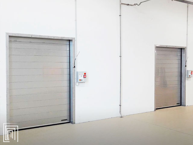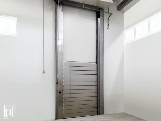 Il sollevamento avviene tramite doppia catena push-pull e contrappesi, eliminando molle e funi soggette a rottura. La motorizzazione trifase 400V con inverter ed encoder assoluto garantisce apertura fino a 2 m/s, continuità di servizio e durabilità fino a 3 milioni di cicli con manutenzione periodica. L’ingombro laterale ridotto e l’assenza di fissaggi a soffitto rendono l’installazione semplice anche in spazi limitati. Le Cold Room richiedono una soglia riscaldata a pavimento per garantire operatività a basse temperature fino a -25°C. Il valore di isolamento termico “U” raggiunge circa 1 W/m²K.